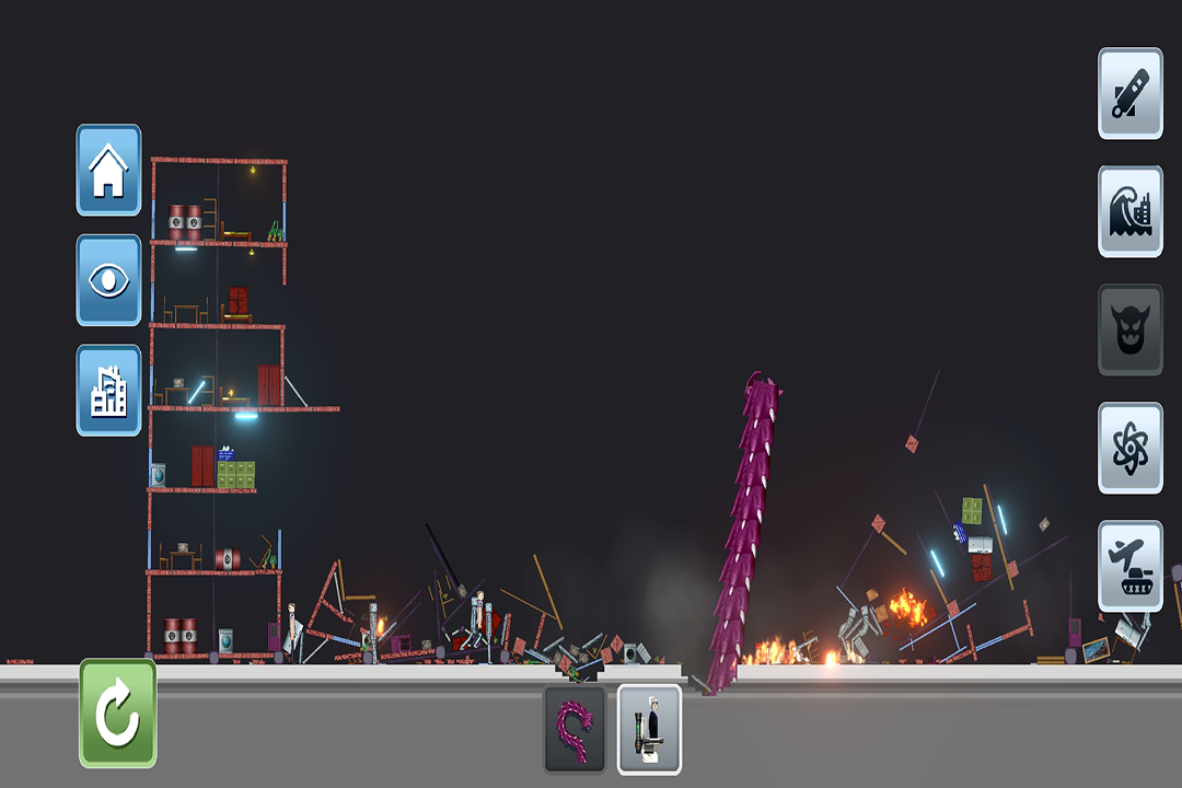 该游戏是一个物理游乐场,您可以在其中用核弹、导弹、黑洞、激光、闪电粉碎城市,或者可能召唤怪物恢复。 建筑物经过精心设计,具有出色的物理逻辑,可以逼真地破坏,因此您可以逼真地见证这些武器造成的破坏。