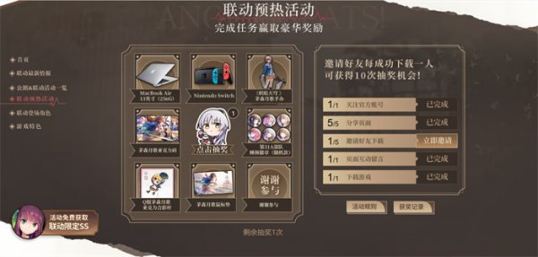 游戏之外,《炽焰天穹》还诚意满满的为玩家准备了联动抽奖活动,玩家通过下载游戏及完成相关页面任务获取抽奖次数,就有几率抽取Macbook、Switch、《炽焰天穹》游戏手办/周边等超多豪华大奖!