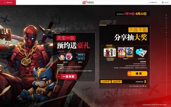 除此之外,玩家在活动期间预约《漫威终极逆转》即可获得一次抽奖机会,点击分享官网活动页可获得额外两次抽奖机会。奖池囊括了《死侍与金刚狼》电影兑换码,英雄神秘变体及保底必得的游戏资源礼包。