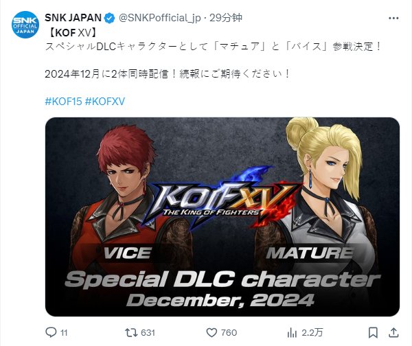 SNK官方在EVO现场宣布,《拳皇15》的新DLC角色公开!“薇思”和“麦卓”将加入该作,预计将于2024年12月正式登场。