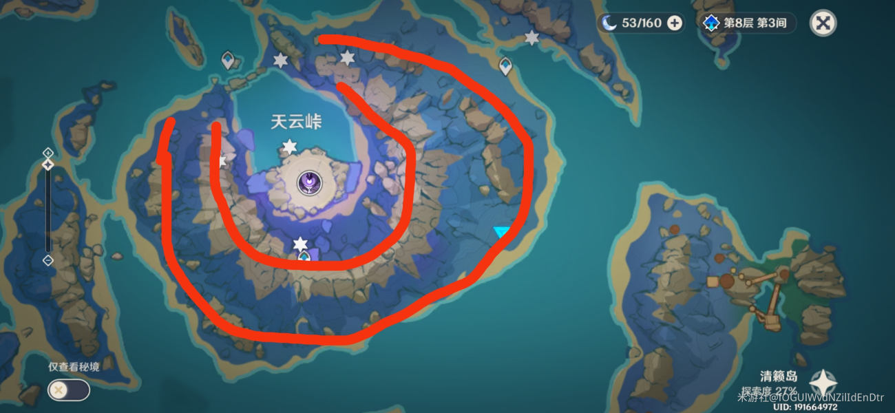 还有一个传送锚点在怪的上方,这个解谜就简单多了。玩家需要完成该区域的前置任务“清籁逐雷记”,平息这里的雷暴天气后,探索完上面说的地宫就可以完成前置任务了。最后在第一个解开的传送锚点处,可以看到很多的传送门设置,穿过这些传送门可以不断的踩着上空浮石。最后点击雷树交换雷种子,可以不断的传送上去,终点就是上空的传送锚点。